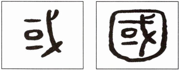 “国”字的字形像用“戈”守卫“口”,在字的周围加方框表示疆域。整个字形表示用兵器守卫家园。