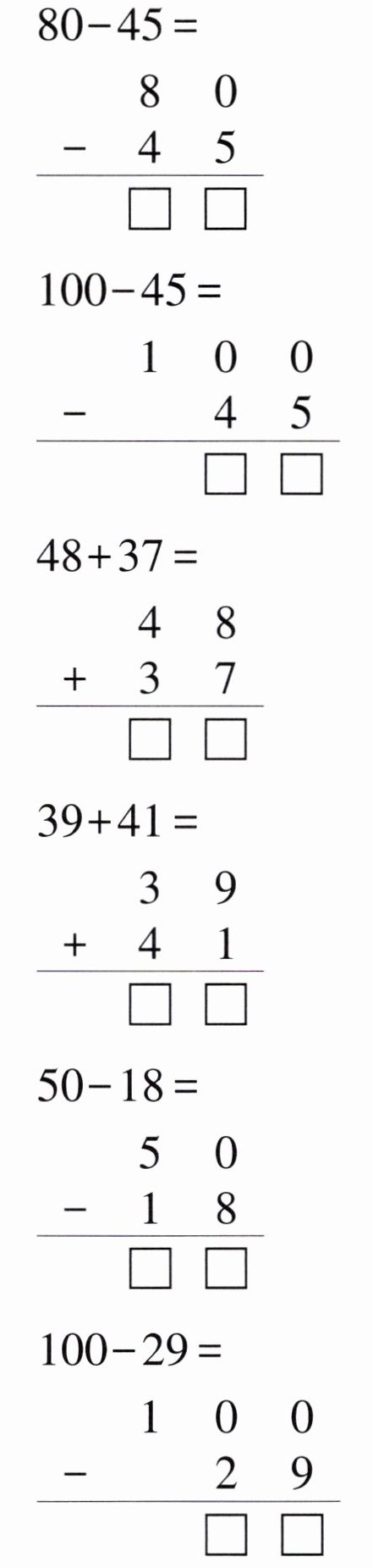 这些题目考查的是100以内数的加减法竖式计算。需要掌握竖式计算的方法,注意数位对齐,从个位开始计算,不够减时向前一位借1当10再减,哪一位上的数相加满十,就向前一位进1。