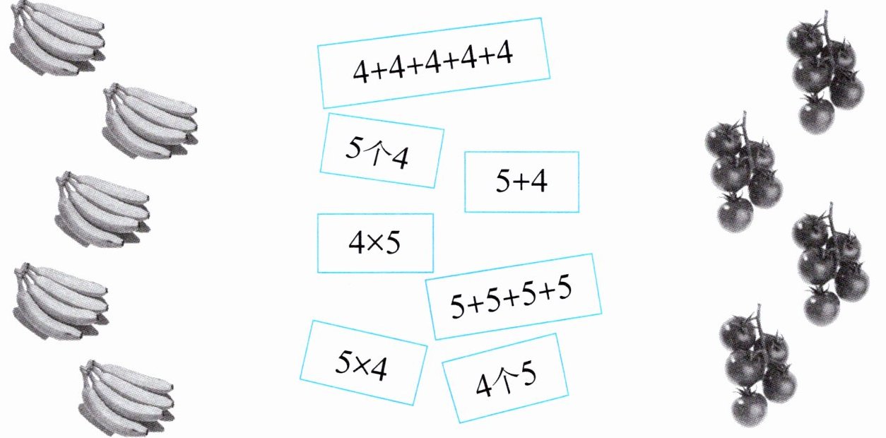 左边香蕉图连4+4+4+4+4、5个4、4×5、5×4;右边西红柿图连5+5+5+5、4个5、4×5、5×4。