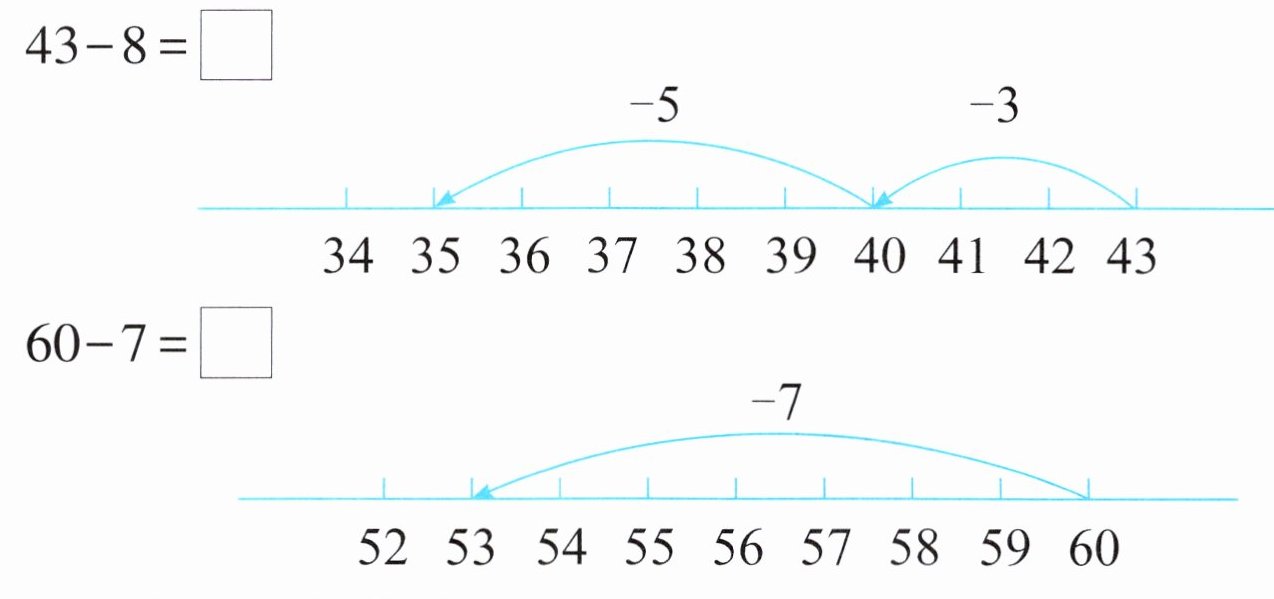 对于$43 - 8$,可以把$8$拆分成$5$和$3$,先从$43$开始在数轴上向左跳$5$个格,此时到$38$,再向左跳$3$个格,到$35$,所以$43 - 8 = 35$。