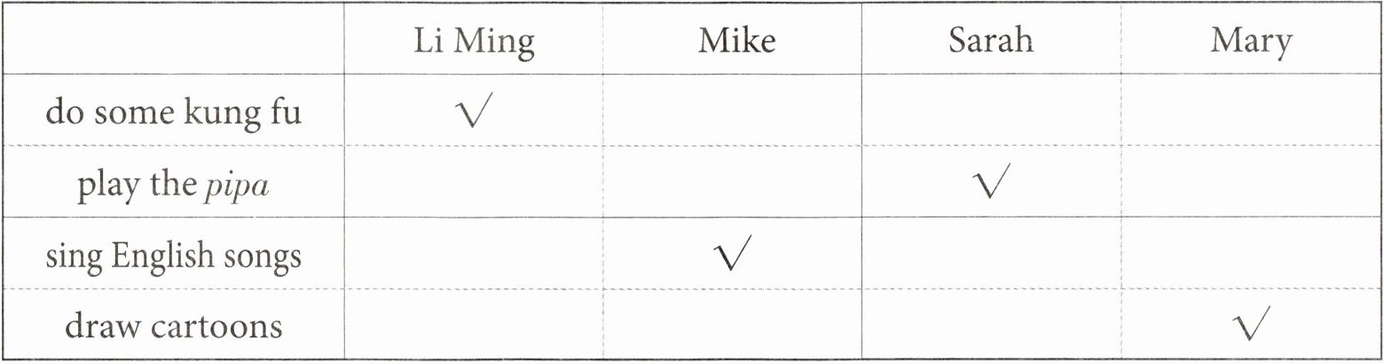 五、1.—What can you do, Mike? —I can sing English songs. 2.—What can you do, Sarah? —I can play the pipa. 3.—What can you do, Mary? —I can draw cartoons.