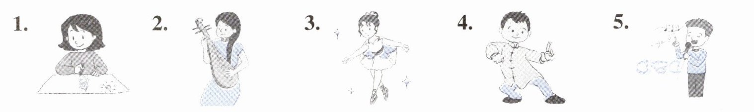 一、1. draw cartoons 2. play the pipa 3. dance 4. do kung fu 5. sing English songs