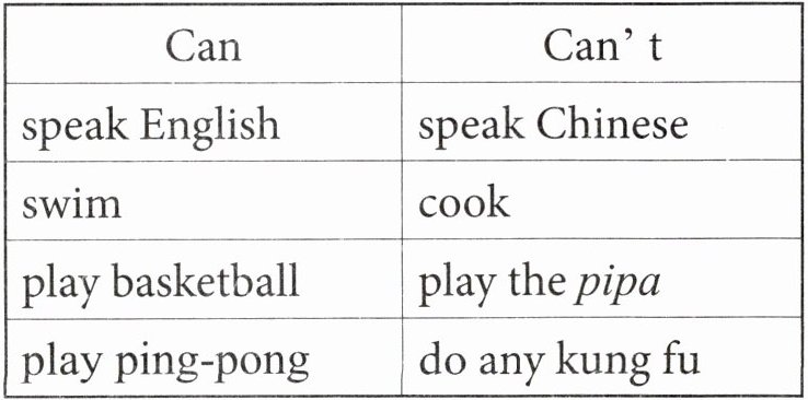 speak English.I can’t speak Chinese.I can swim.I can’t cook.I can play basketball.I can’t play the pipa.I can play ping-pong.I can’t do any kung fu.