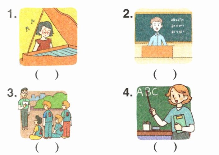 1. Mr Yang A. music a. old 2. Miss Wu B. English b. funny 3. Miss Li C. maths c. kind 4. Mr Wang D. PE d. strict