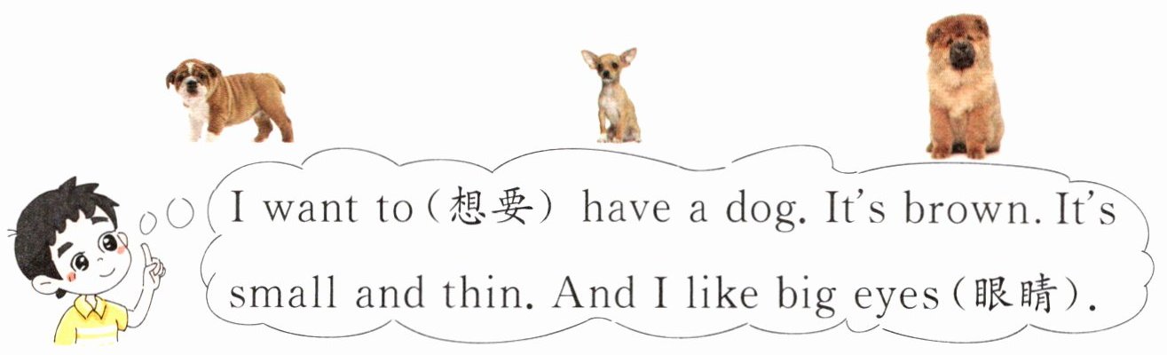 I want to (想要) have a dog. It's brown. It's small and thin. And I like big eyes (眼睛).