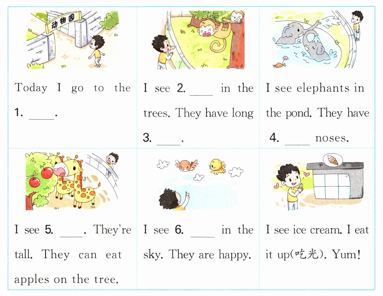 A. giraffes B. monkeys C. long D. zoo E. tails F. birds
