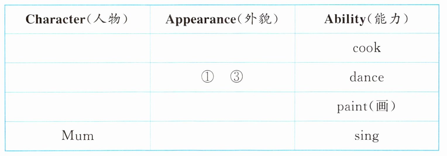 九、读绘本,找到对应的人物及外貌特征,补全表格。