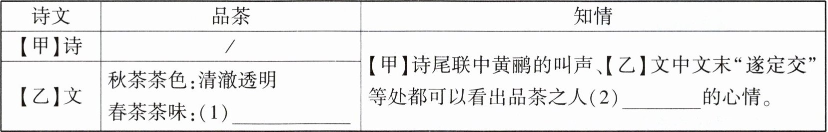 | 【甲】诗 | / | 【甲】诗尾联中黄鹂的叫声、【乙】文中文末“遂定交”等处都可以看出品茶之人(2)______的心情。 |