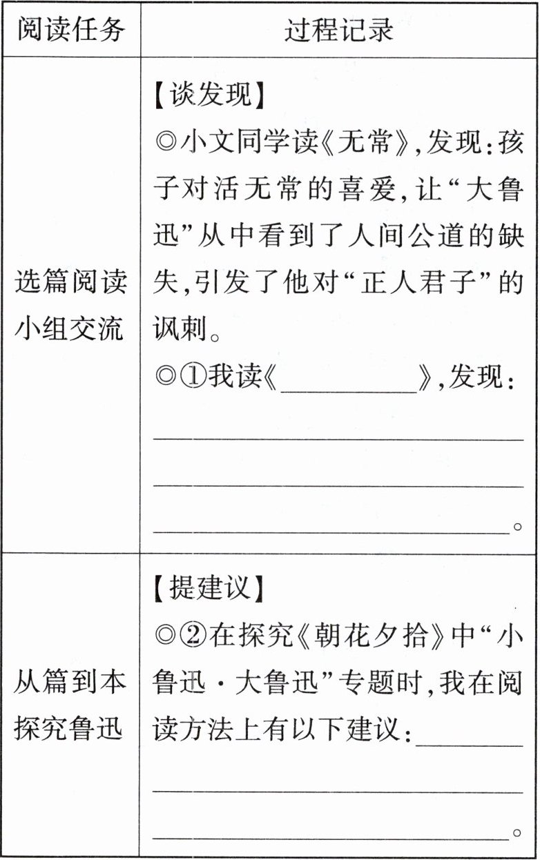 |选篇阅读 小组交流 【谈发现】 小文同学读《无常》,发现:孩子对活无常的喜爱,让“大鲁迅”从中看到了人间公道的缺失,引发了他对“正人君子”的讽刺。 ①我读《______》,发现:______。|示例:我读《从百草园到三味书屋》,发现:百草园的有趣生活与三味书屋的枯燥形成对比,表达了孩子对自由生活的向往。|