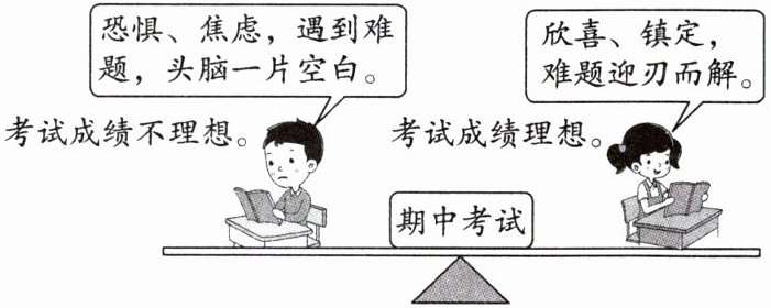 (1) 心理情绪与学习生活的关系:考试成绩理想时,会感到欣喜、镇定,难题迎刃而解;考试成绩不理想时,会恐惧、焦虑,遇到难题头脑一片空白。