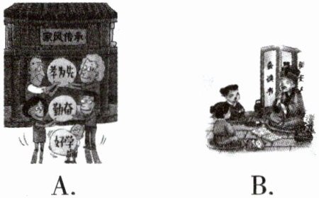 (1)示例:B(1分) B图中有一位老人陪着两个孩子团坐在一起谈论着,三人中间有一本摊开来的书,三人的侧后方是一块书写着“会读书、做好人”等字样的屏风。这些图画元素与主题中“少年”“读书”相吻合。而A图没有体现出与主题相关的内容。所以B最适合。(2分)