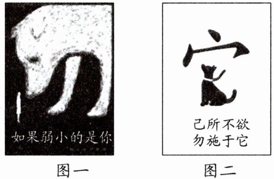 (3)示例一:我推荐图一。图中一只庞然大狗正低头冷漠地审视着蝼蚁般渺小的人,强烈反差让人顿失安全感,下面一行醒目的大字“如果弱小的是你”引人换位思考,唤醒人类关爱动物的良知,十分契合活动主题。 示例二:我推荐图二。“宀”本义为房屋,房屋下面关着一只蹲坐的狗,被绳拴着,仰头眼巴巴期盼着主人归来,孤独而可怜,激起人的保护欲。下面“己所不欲,勿施于它”的字样,呼吁人们关爱动物,与活动主题相符。(3 分)