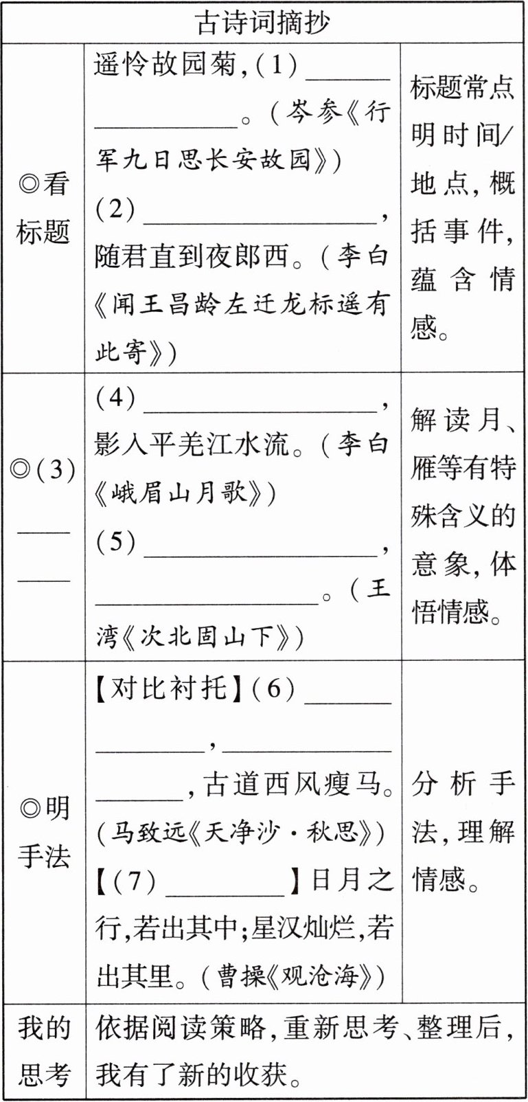 | ○明手法 | 【对比衬托】(6)______,______,古道西风瘦马。(马致远《天净沙·秋思》)【(7)______】日月之行,若出其中;星汉灿烂,若出其里。(曹操《观沧海》) | 分析手法,理解情感。 |