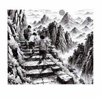 | 画面描述:山路上铺满金黄落叶,三名同学互相搀扶攀登,远处山顶有朝阳。 | |
