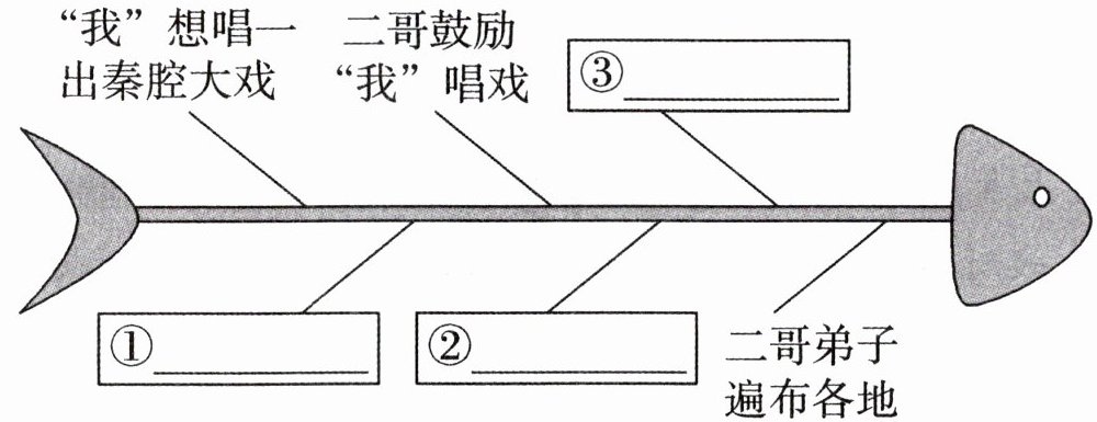 6. 【准备】拍摄微电影之前,同学们计划用鱼骨图来梳理与"二哥"有关的内容,请你帮忙完成。(3分)