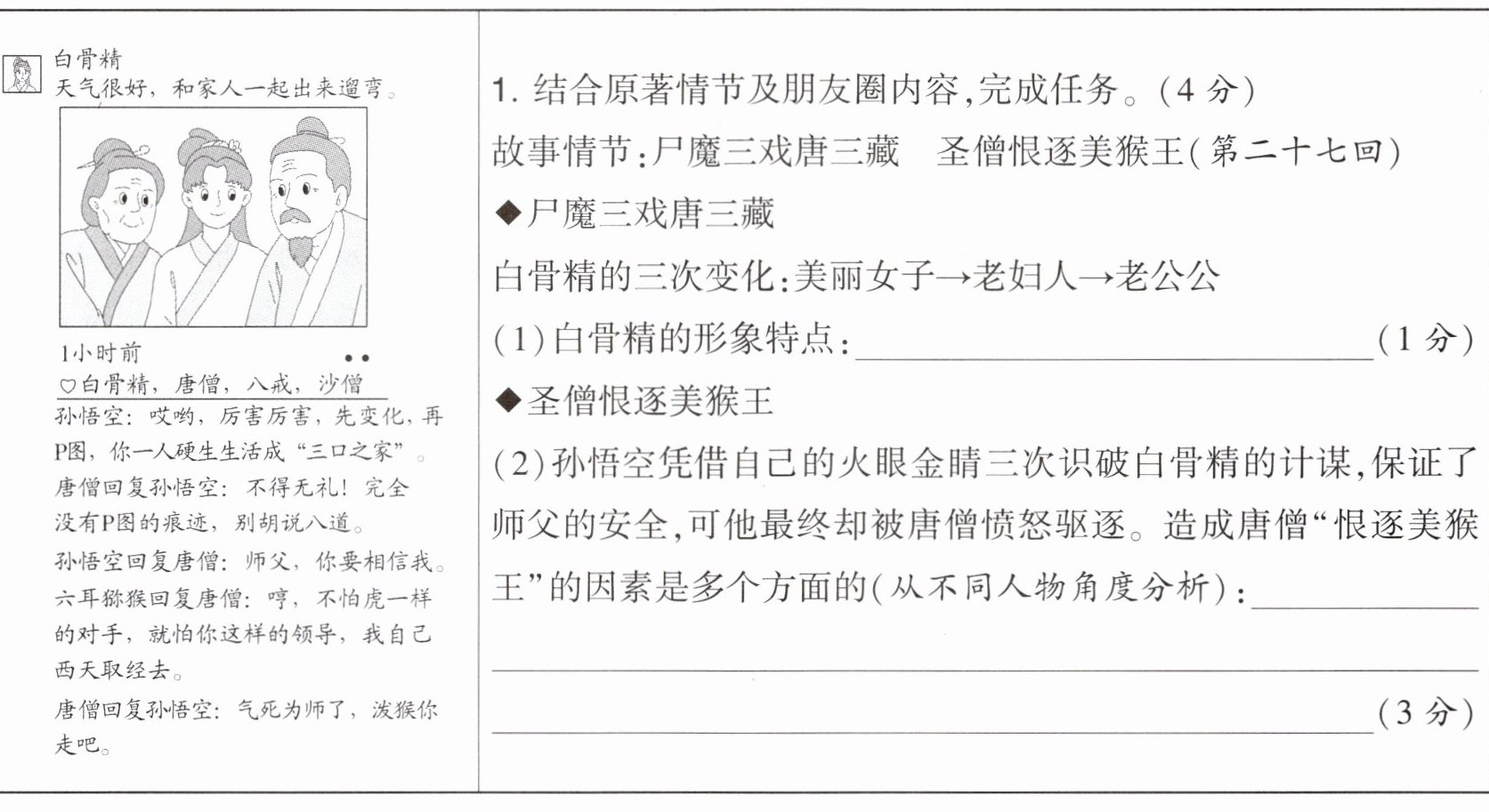 1小时前 白骨精,唐僧,八戒,沙僧 孙悟空:哎哟,厉害厉害,先变化,再P图,你二人硬生生将成“三口之家”。 唐僧回复孙悟空:不得无礼!完全没有P图的痕迹,明胡说道。 孙悟空回复唐僧:师父,你要相信我。六耳猕猴回复唐僧:哼,不怕虎一样的对手,就怕你这样的领导,我自己西天取经去。 唐僧回复孙悟空:气死为师了,泼猴你走吧。 | 1. 结合原著情节及朋友圈内容,完成任务。(4 分) 故事情节:尸魔三戏唐三藏 圣僧恨逐美猴王(第二十七回) ◆尸魔三戏唐三藏 白骨精的三次变化:美丽女子→老妇人→老公公 (1)白骨精的形象特点:______(1 分) ◆圣僧恨逐美猴王 (2)孙悟空凭借自己的火眼金睛三次识破白骨精的计谋,保证了师父的安全,可他最终却被唐僧愤怒驱逐。造成唐僧“恨逐美猴王”的因素是多方面的(从不同人物角度分析):______(3 分) |