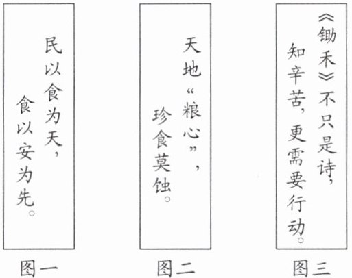 (3)示例一:我喜欢图一,因为图一中“民以食为天,食以安为先”强调了“安”的重要性,食物以安全为首要,强调食品安全。 示例二:我喜欢图二,“天地‘粮心’,珍食莫蚀”告诉我们勤俭节约人人有责,需要人人尽责。要珍惜每一粒粮食,不要浪费。 示例三:我喜欢图三,“《锄禾》不只是诗,知辛苦,更需要行动”这告诉我们不仅要有节俭意识,更要有具体的行动。我们应该厉行节俭,向浪费说“不”,向节约说“好”。