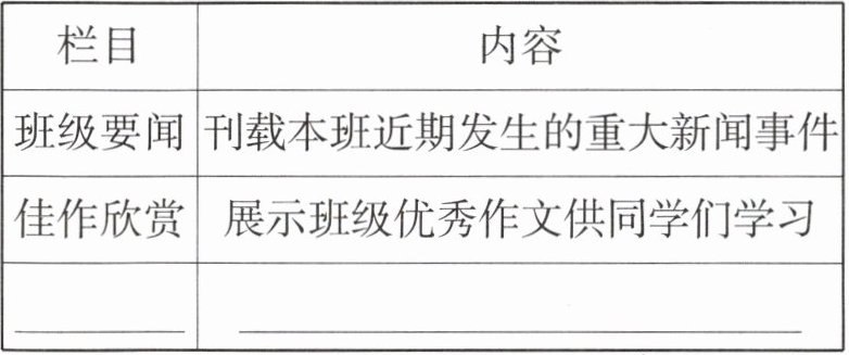 3.【设计栏目】班级刊物准备设计三个栏目,请你仿照示例将表格补充完整。(2 分)