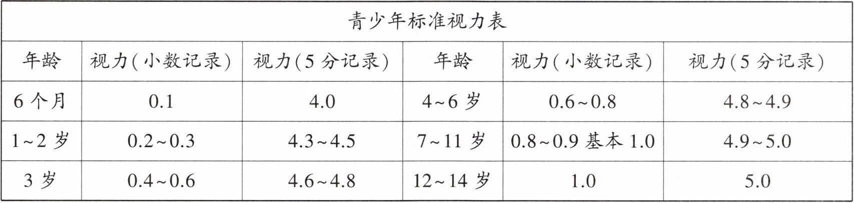 材料二:安格利亚鲁斯金大学眼科教授伯恩对未来视力问题做了一个报告。他说:“预计到2050 年,全球约有一半的人口患近视,因此近视是一个正在迅速升级的健康问题。”参考 0~14 岁青少年标准视力表,你家孩子视力达标了吗?