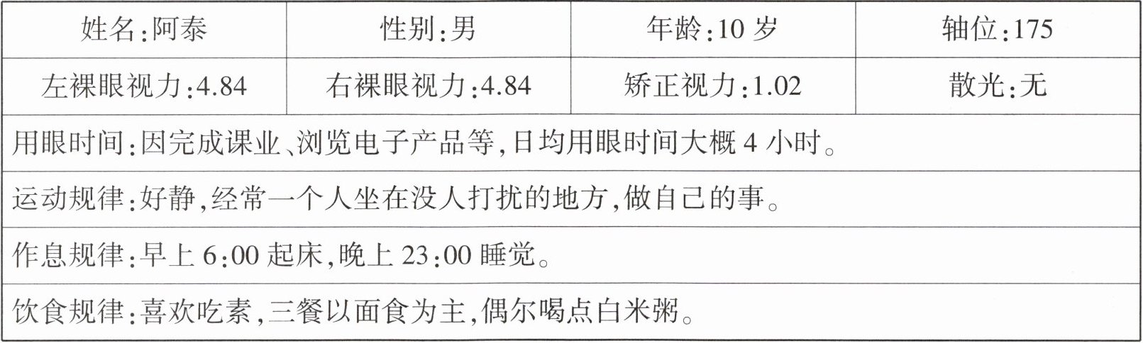 8. 在老师的建议下,阿泰去医院的眼科门诊做了一次检查,下面是他的检查报告,请你结合材料三,给阿泰提供一些有助于改善和提高视力的建议,并说明理由。(4 分)