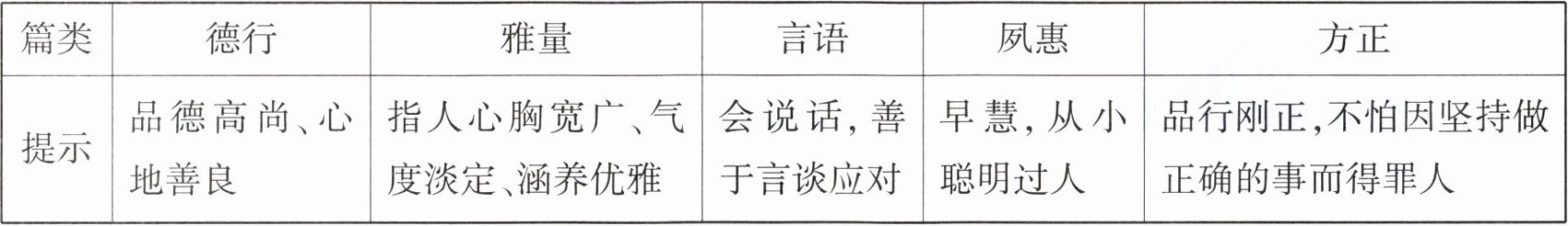 | 篇类 | 德行 | 雅量 | 言语 | 夙惠 | 方正 |