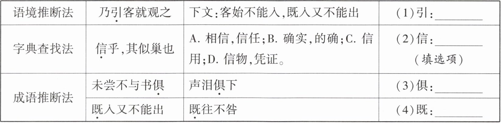 |语境推断法|乃引客就观之|下文:客始不能入,既入又不能出|(1)引:______|