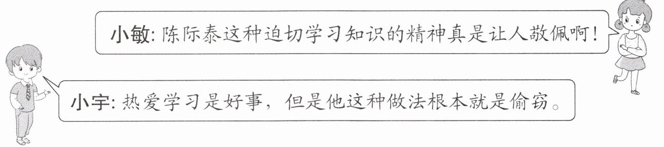 4.示例一:我同意小宇的说法。爱读书固然是好事,但他这种行为从根本上来说就是错误的。陈际泰因为自己家贫无书就去拿邻家孩子和自己舅家的书,这是不可取的。偷窃是道德问题,任何理由都不能成为偷窃的借口,学知识之前先要学会做人。示例二:我同意小敏的看法。这两句话充分体现了陈际泰的好学,虽然他当时有偷书的行为,但是为了学习,而且他的家庭也确实非常贫困,偷窃别人的书也是万般无奈下的行为,情有可原。而且他后来的成就也非常大,这完全可以让我们忽略他以前犯下的小错误。