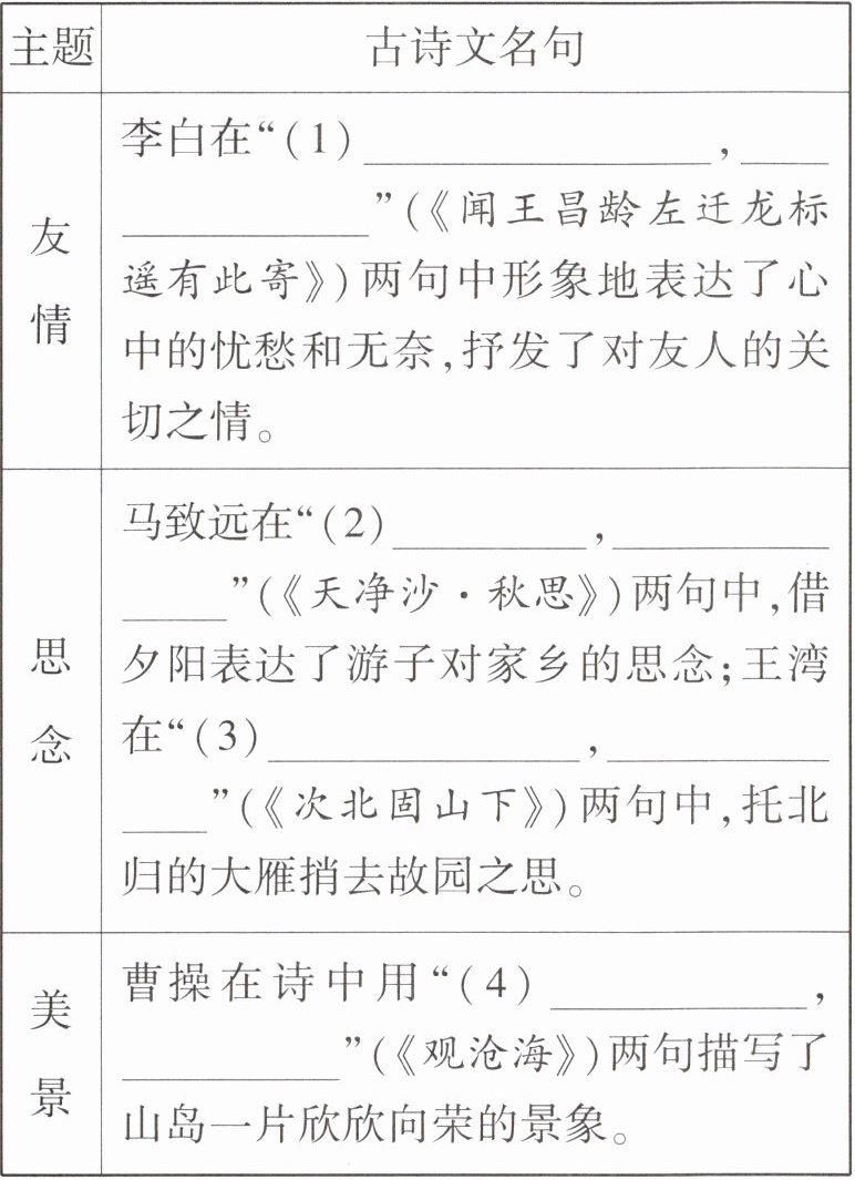 | 思念 | 马致远在“(2)______,______”(《天净沙·秋思》)两句中,借夕阳表达了游子对家乡的思念;王湾在“(3)______,______”(《次北固山下》)两句中,托北归的大雁捎去故园之思。 |