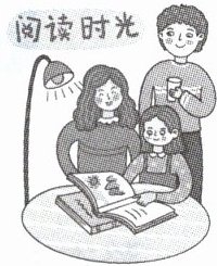 4. 示例:画面左边的灯盏,发出光芒,照亮了右边的一家人,孩子手中摊开一本书,正在阅读。妈妈面带微笑坐在旁边注视着书籍,爸爸端着一杯水站在她们身后,眼神也落在书上。上方的四个字说明,这是一家人的阅读时光。这幅图画告诉我们,只要每天抽出一点时间,拿起书本,与孩子依偎在一起,就可以共享亲子阅读的幸福时光,在阅读中增长智慧、开阔视野、陶冶情操,也使家庭更加和谐。
