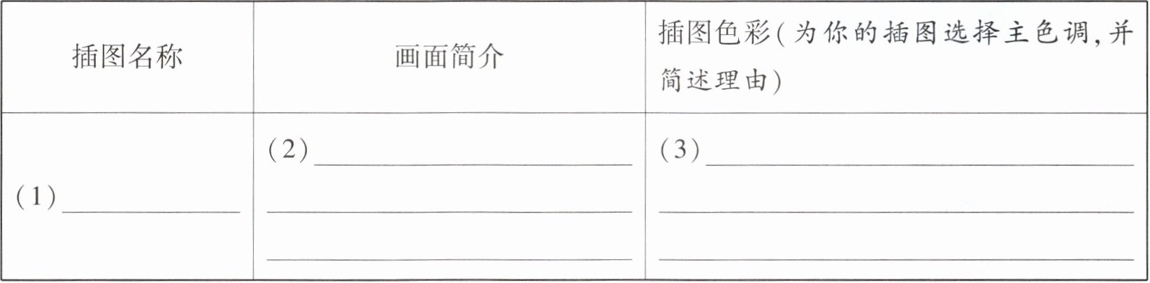 | 插图名称 | 画面简介 | 插图色彩(为你的插图选择主色调,并简述理由) |
