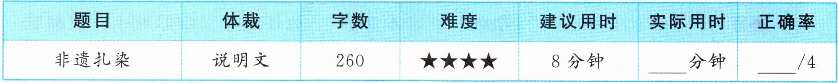 ②People in old times used tie-dye(扎染). Tie-dye is a very old way of dyeing clothes in China—it's more than 1,000 years old! It is popular in Yunnan. People first put cloth(布料) into the blue dye(染料). Some parts of the cloth become blue, but other parts have a lighter colour. When you open out the cloth, you'll see beautiful patterns.