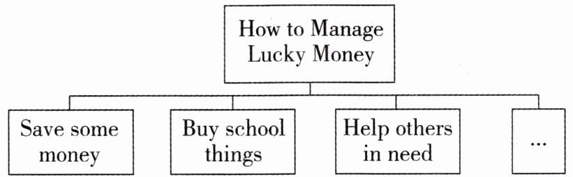 So we should manage our lucky money well. First,save some money for the future. We should keep some money for a rainy day. Second,use some to buy school things. This can help us learn more and do better in school. Third,we can also give some to help others in need. Helping others brings us joy. Lastly,spend a bit on what we like. It’s OK to have fun with our lucky money! By managing lucky money wisely,we can make it more meaningful.