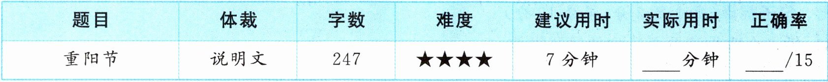 People follow several customs 4 Double Ninth Festival. For example, people often 5 the cornels twigs(山茱萸嫩枝) on their arms or heads just because they believe this plant can prevent diseases(疾病) and avoid disasters. 6, people like to climb 7 on this day, so Double Ninth Festival is 8 “Mountain-climbing Festival”. The 9th Chinese lunar month often has 9 skies and fresh air. It is a good time for 10. When people stand on a height, they will have a good view of the blue sky and colourful mountains, which makes 11 feel free and joyful. Double-Ninth cake is also known as “flower cake”. It is said that the 12 was originally(最初) prepared after autumn harvest, because farmers wanted to have a(n) 13 of what was just in season. Then gradually it became the cake for people to eat on Double Ninth Festival. Double Ninth Festival is a festival for the 14. People get together to show their 15 and concern(关心) for their parents or their grandparents.