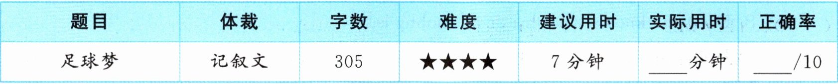 One day I was told by my teacher that there was a football team just for girls and they were getting r 5 for a competition(比赛) in March. I really wanted to be part of the team and I decided(决定) to try my b 6.
