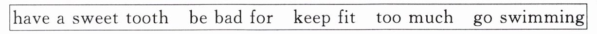1. What else do you never eat/have? 2. I sleep for eight hours every night and I have a good sleep. 3. Too little exercise is bad for us. 4. He plans to change the unhealthy lifestyle. 5. I have a sweet tooth but I need to say no to too much sugar.