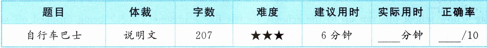 Now there are about 1,000 students in Barcelona “taking the bike bus” every week. The “bike bus” l 4 the first stop at 8:25 every Friday morning. There are three “s 5 ”. The ride t 6 25 minutes from the first stop to the school. Some parents also j 7 them. They ride bikes to go to work on Fridays. It's like a big party.