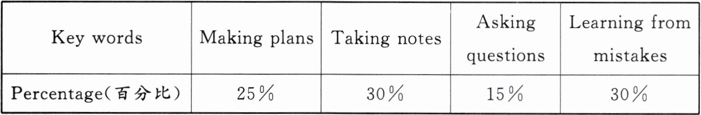 )7. Here is a survey about how to be a good learner among 800 students. According to the form below, ______ students have chosen "Learning from mistakes(错误)" as their key words.A.120