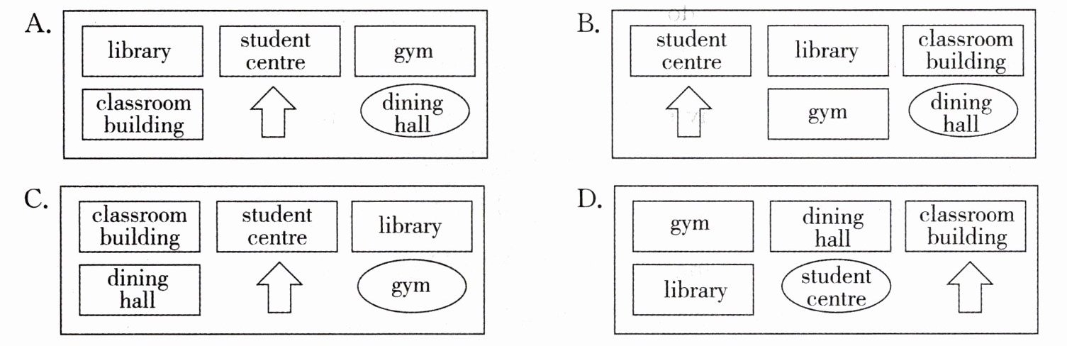 I’m Jim. This is my school. Welcome to my school. When you walk into the school yard, you will see the gym first. Many students like to play basketball in it. Look! That is the library. It’s between the student centre and our classroom building. It’s big and clean. There are different kinds of books in it. All the students in our school like reading in the library. That is our dining hall. It is my favourite place. I can have noodles, pizzas, beef and other food there.