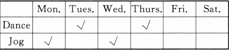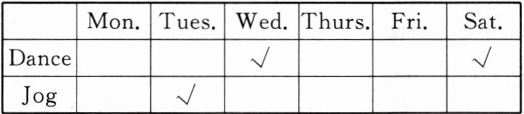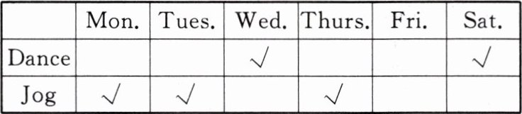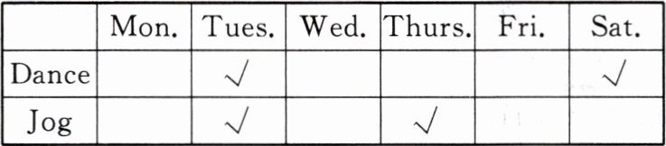 Peter:To keep fit, I mainly do two things—dance and jog. I dance every Wednesday and Saturday. And I go jogging three times a week. Sometimes I jump rope in the evening.