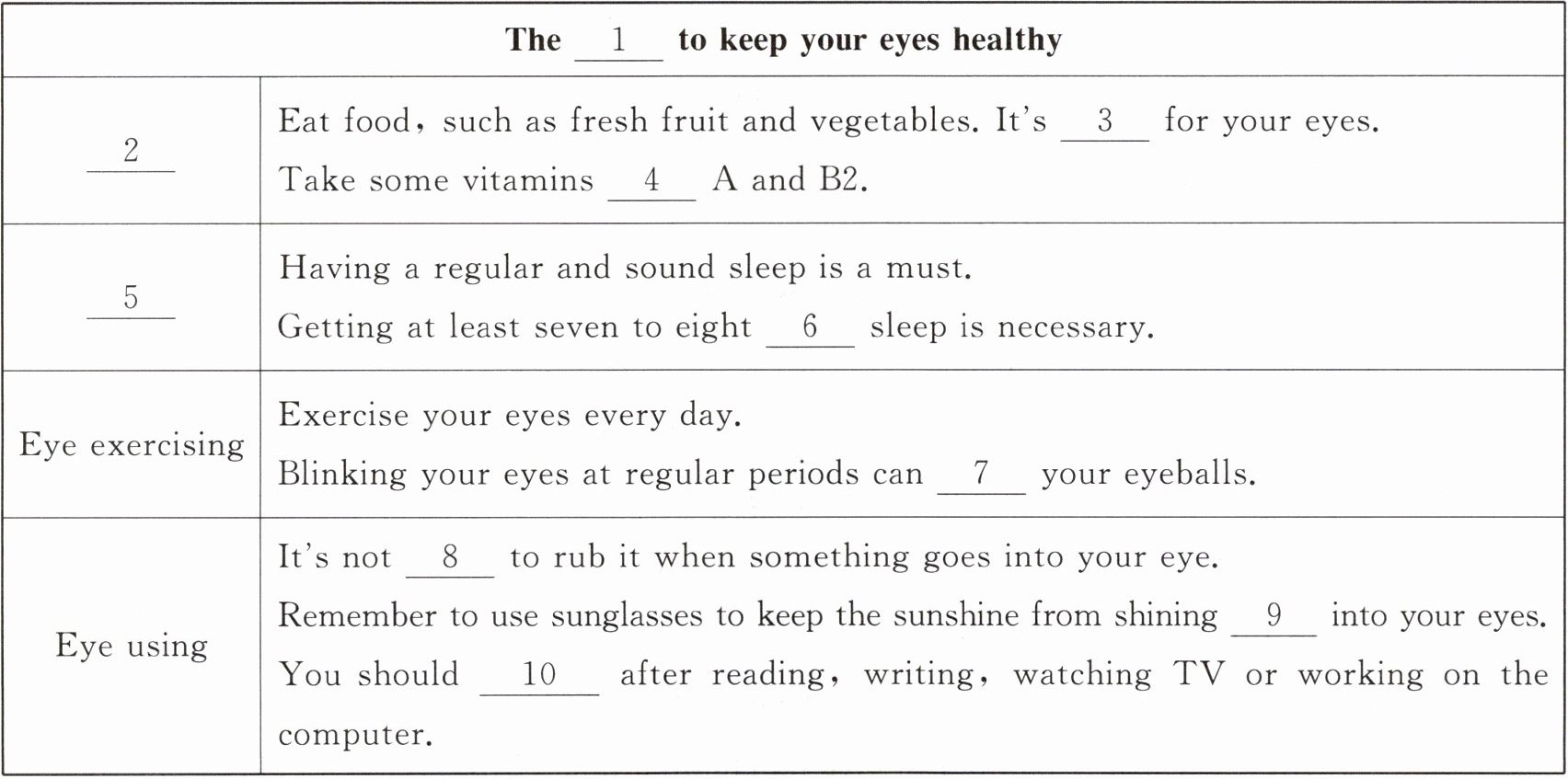 Next, it's necessary for you to exercise eyes every day. Blink(眨眼) your eyes at regular times, and it can give the eyeballs a good wash.