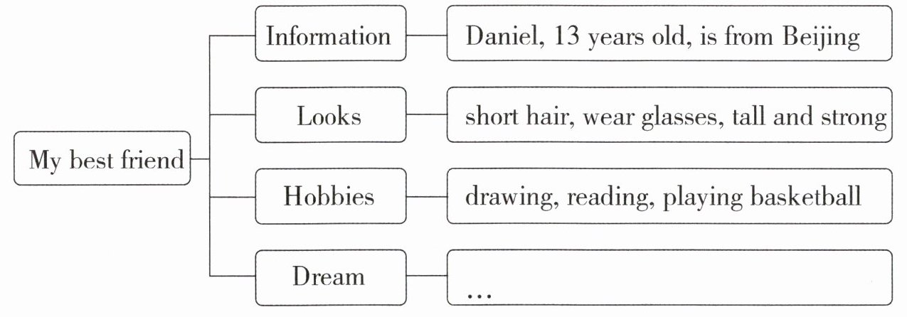 I am Lily from Class 2, Grade 7. I’d like to tell you something about my best friend Daniel.___We are in the same class. He is 13 years old. He is from Beijing. He has short hair. He wears glasses. He looks tall and strong. He also likes drawing and reading. We often go to the library together. He likes playing basketball. Our school starts at 8:00 in the morning. At lunchtime,he enjoys chatting with his friends. He loves after-school activities a lot.