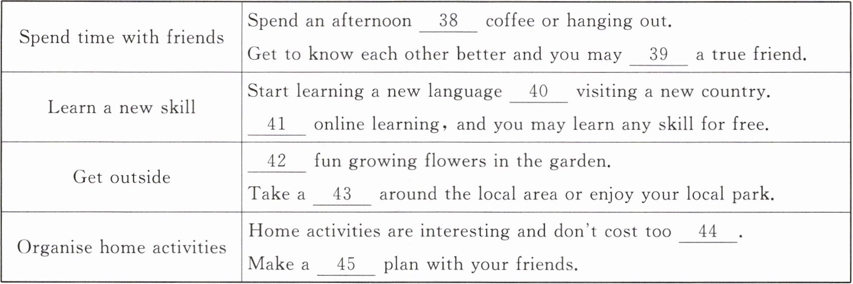 Now you have lots of time to learn the skills you really want to try. For example, you could start learning a new language if you're going to travel to that country soon. There are lots of websites(网站) and apps. They can help you learn any skill, and often for free. Give them a try while you really want to learn.