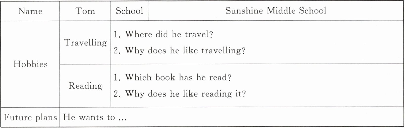 One possible version: My new friend Last month, I made a new friend, Tom, a student in Sunshine Middle School. Tom has many hobbies. He likes travelling. He thinks travelling is quite interesting. Last year, he visited Shenzhen with his parents. He likes this modern city because he can enjoy the beautiful sea around Shenzhen. He also likes reading books. Recently he has read The Old Man and the Sea. He was deeply moved by the old man and his spirit. The book tells him that no matter how big the challenge is, don't give up halfway. In the future, he would like to do something to protect the environment. He thinks people should stop factories from putting the waste into rivers, and plant more trees to make the air fresh. He believes we can make the world a better place.