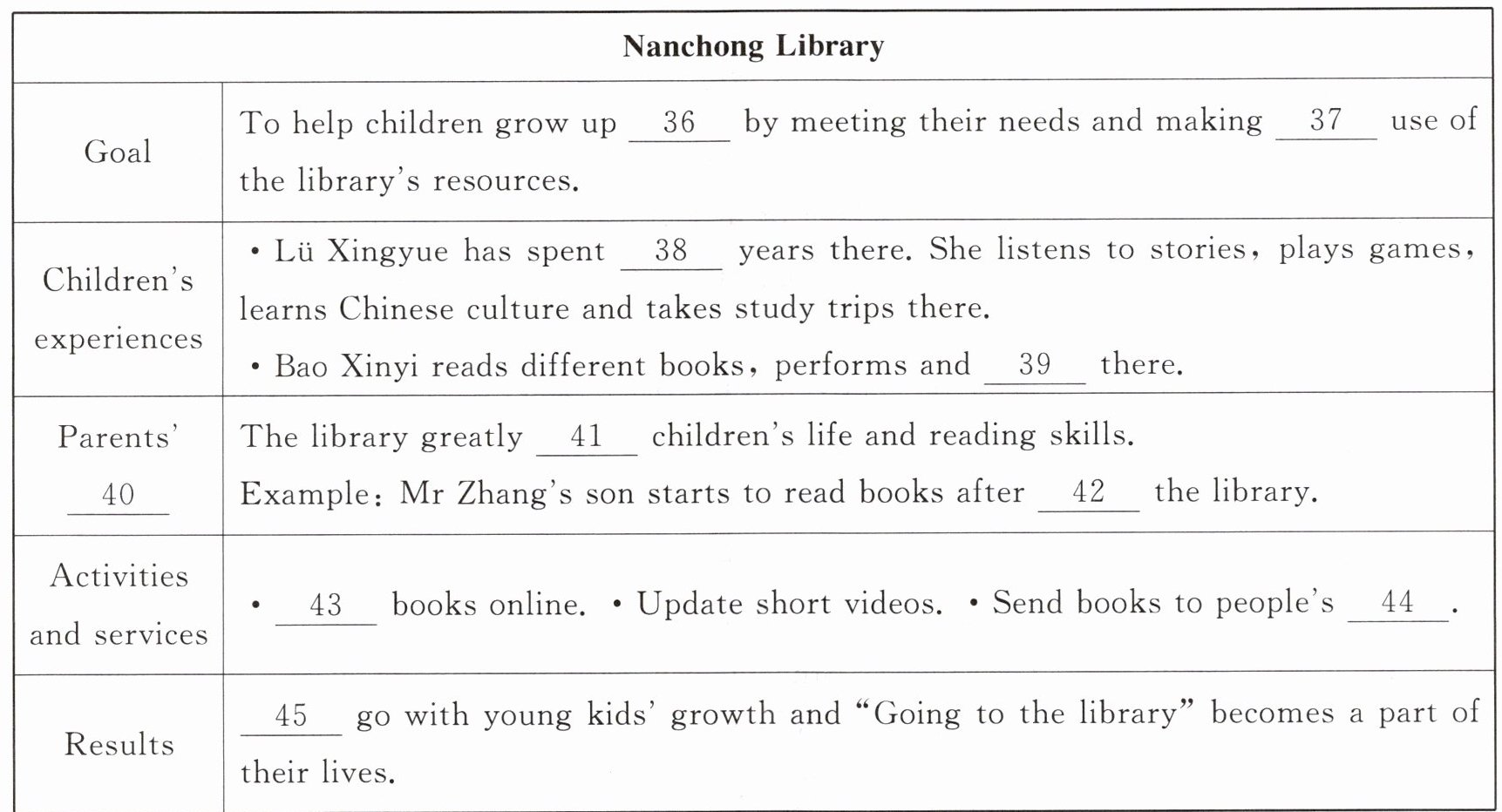 Nanchong Library always tries to meet children's needs and make the most of its resources(资源) to help children grow up in a healthy environment.