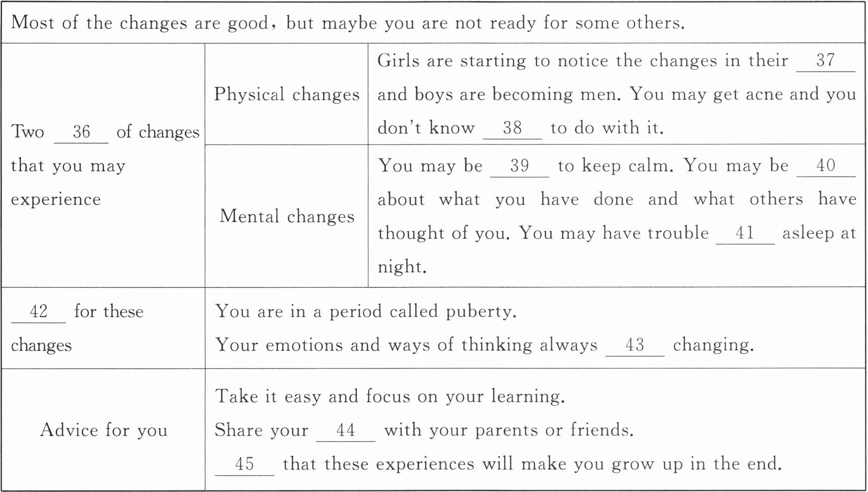 You are changing mentally(精神上) as well because these changes bring more challenges(挑战) to you. When you deal with them, maybe you can't keep calm. As time goes by, you care more about how you look in the eyes of others. At the same time, you may worry about your grades and worry if you forgot to do your chores. These thoughts can even keep you wake up at night.