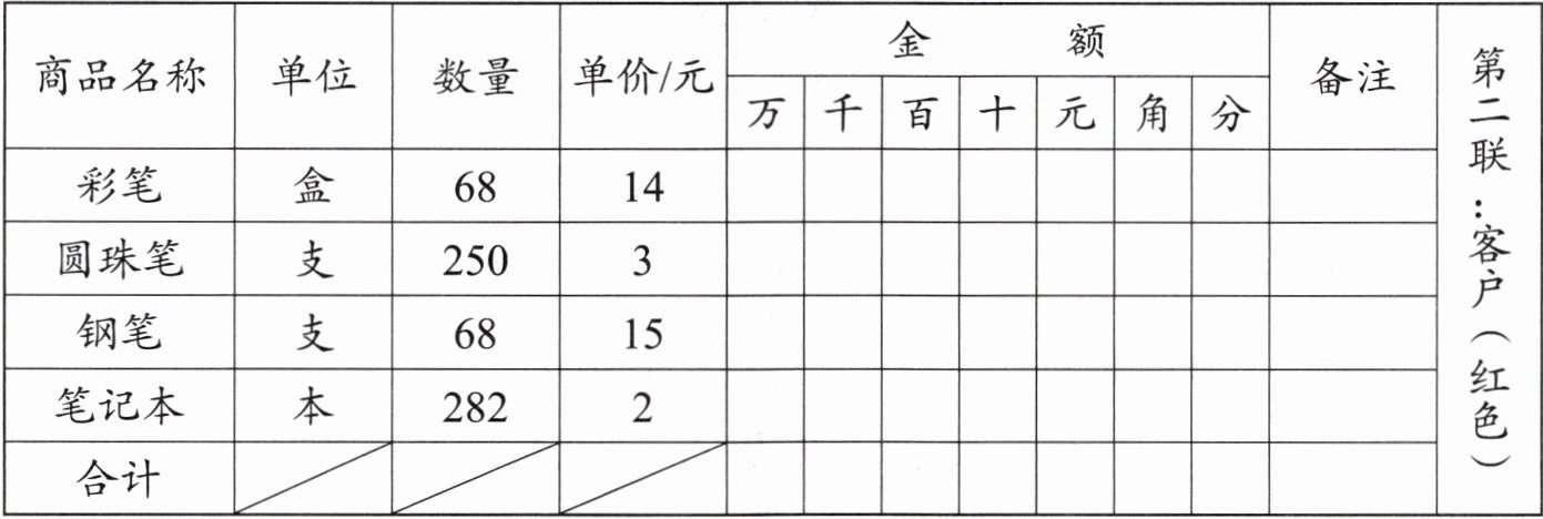 1. 这是一张购买文具的收据,请填出相应的金额。先笔算,再用计算器验算一下。