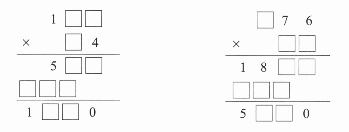 $\begin{array}{r} □ 76 \\ × □ □ \\ \hline 18 □ □ \\ □ □ □ \\ \hline 5 □ □ 0 \end{array}$