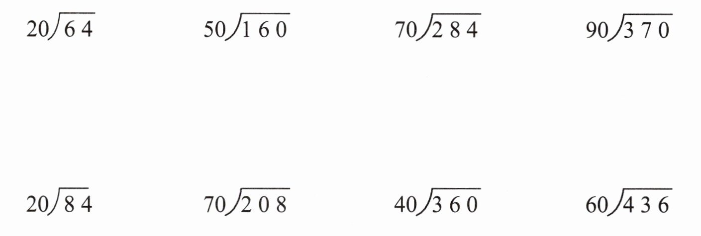 $\begin{array}{r}20\enclose{longdiv}{64}\end{array}\quad\begin{array}{r}50\enclose{longdiv}{160}\end{array}\quad\begin{array}{r}70\enclose{longdiv}{284}\end{array}\quad\begin{array}{r}90\enclose{longdiv}{370}\end{array}$
