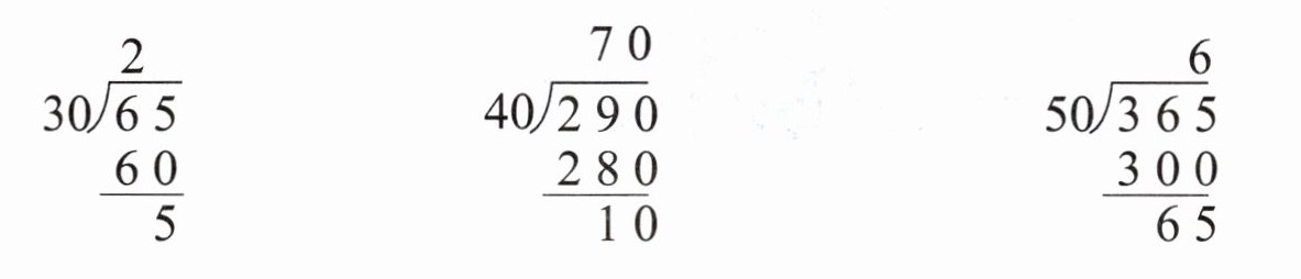 $\begin{array}{r}2 \\30\enclose{longdiv}{65} \\\underline{60} \\5\end{array}\quad\begin{array}{r}70 \\40\enclose{longdiv}{290} \\\underline{280} \\10\end{array}\quad\begin{array}{r}6 \\50\enclose{longdiv}{365} \\\underline{300} \\65\end{array}$