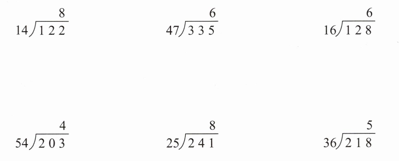 $\begin{array}{r} 8 \\ 14\enclose{longdiv}{122} \end{array}$ $\begin{array}{r} 6 \\ 47\enclose{longdiv}{335} \end{array}$ $\begin{array}{r} 6 \\ 16\enclose{longdiv}{128} \end{array}$